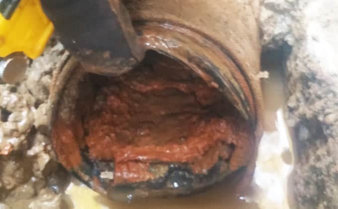 Exemple d’obstruction d’un drain par de l’ocre ferreux empêchant le drainage adéquat de l’eau.