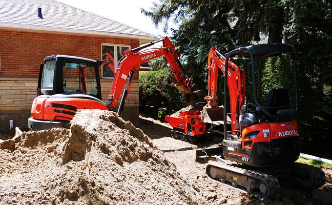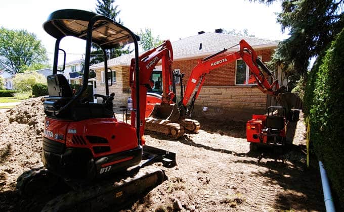 Nous devons alors procéder, de l’extérieur, en excavant une portion de la fondation avec une mini pelle Kubota KX018.